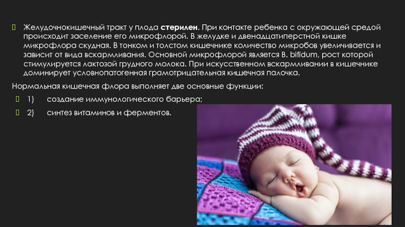 Слайд 9Желудочнокишечный тракт у плода стерилен. При контакте ребенка с окружающей