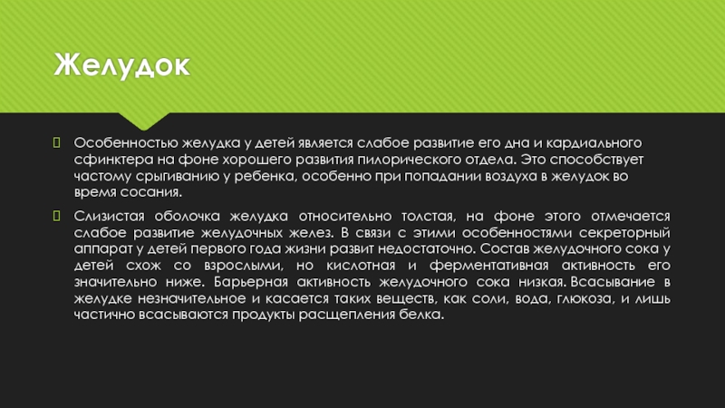 Желудок Особенностью желудка у детей является слабое развитие его дна и кардиального сфинктера на фоне хорошего развития пилорического
