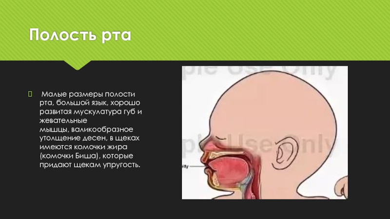 Полость рта Малые размеры полости рта, большой язык, хорошо развитая мускулатура губ и жевательные мышцы, валикообразное утолщение десен, в щеках имеются комочки жира (комочки Биша), которые придают щекам упругость.