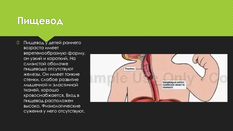 Пищевод Пищевод у детей раннего возраста имеет веретенообразную форму, он узкий и короткий. На слизистой оболочке пищевода отсутствуют железы.