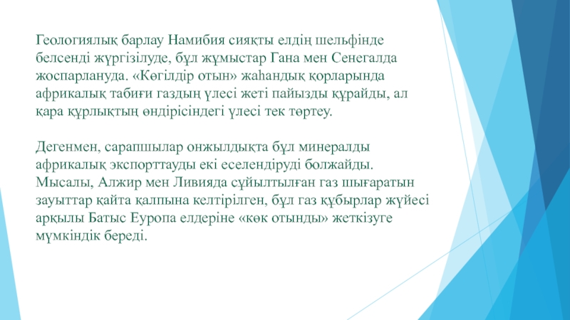 Слайд 28Геологиялық барлау Намибия сияқты елдің шельфінде белсенді жүргізілуде, бұл жұмыстар