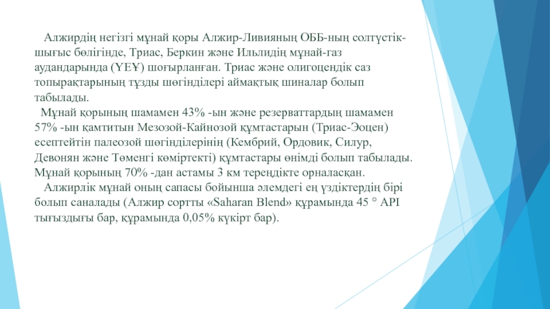 Слайд 6Алжирдің дәлелденген мұнай қоры - 9 миллиард баррельден асады.