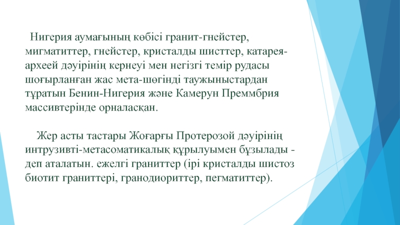 Нигерия аумағының көбісі гранит-гнейстер, мигматиттер, гнейстер, кристалды шисттер,