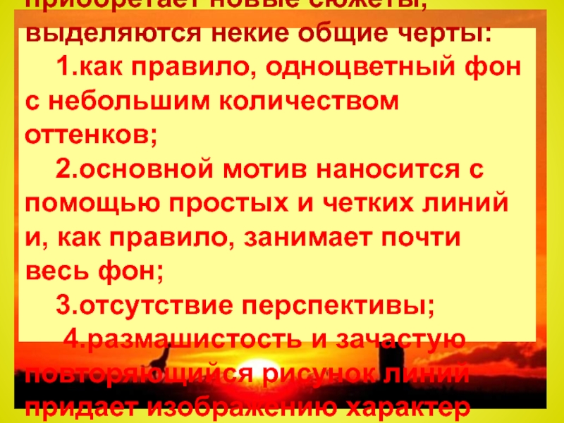 4.размашистость и зачастую повторяющийся рисунок линий придает изображению характер живого экспрессивного орнамента.