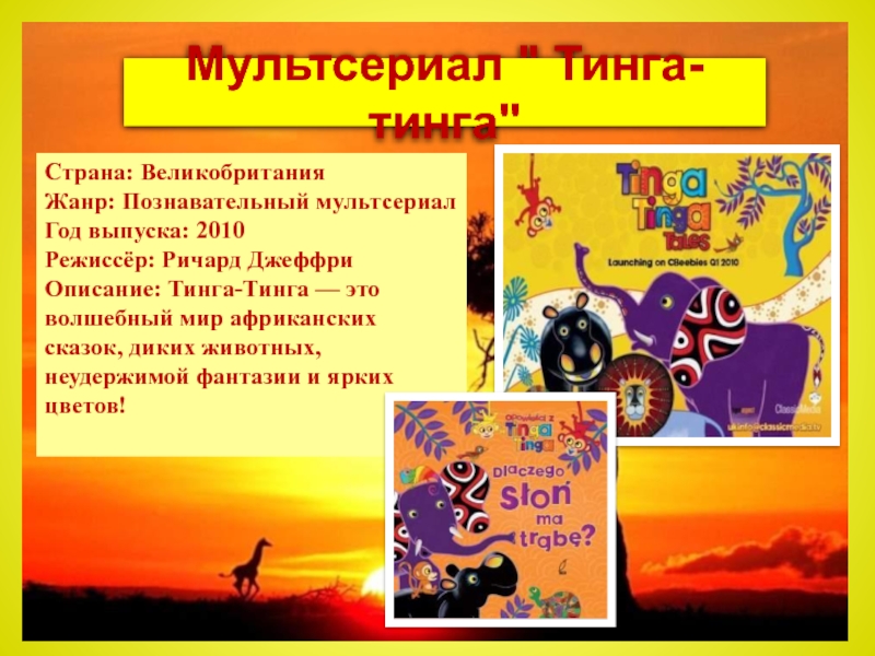 Мультсериал " Тинга-тинга"Страна: Великобритания Жанр: Познавательный мультсериал Год выпуска: 2010 Режиссёр: Ричард Джеффри Описание: Тинга-Тинга — это волшебный мир африканских сказок, диких животных, неудержимой фантазии и ярких цветов!