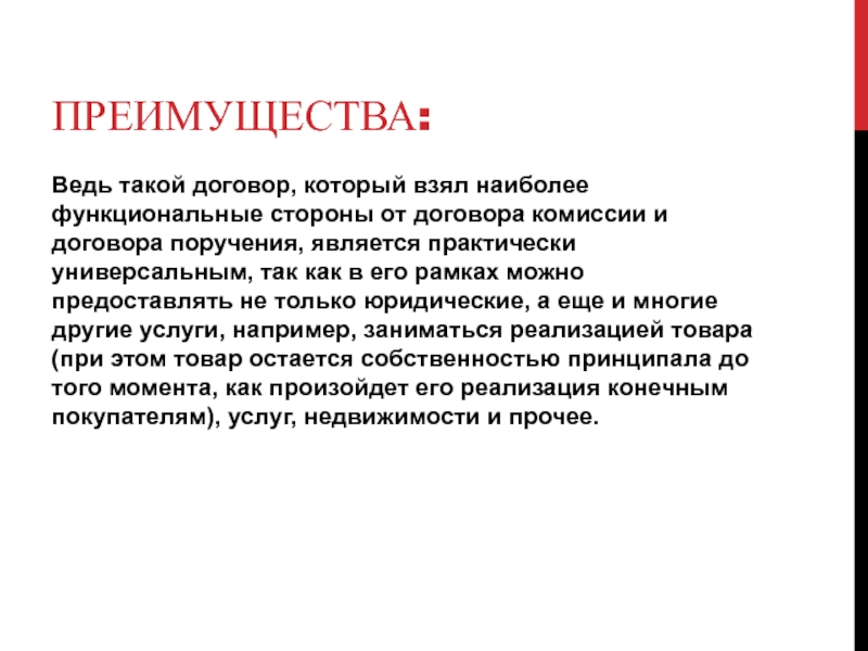 в его рамках можно предоставлять не только юридические, а еще и многие другие услуги, например, заниматься реализацией товара (при этом товар остается собственностью принципала до того момента, как произойдет его реализация конечным покупателям), услуг, недвижимости и прочее.