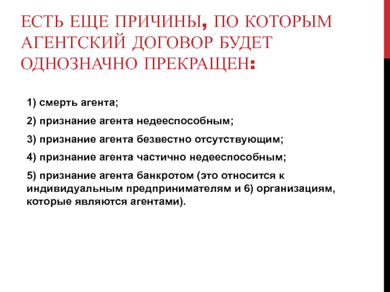 Слайд 12Есть еще причины, по которым агентский договор будет однозначно прекращен: