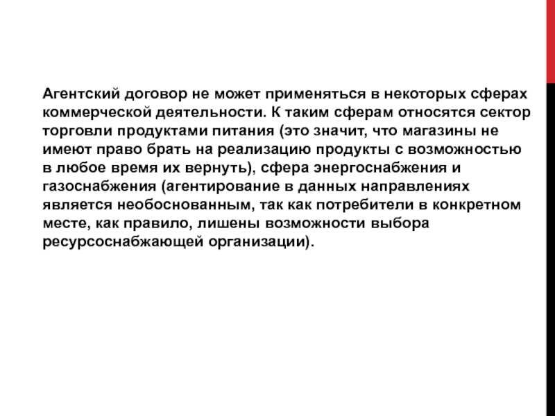 Слайд 19Агентский договор не может применяться в некоторых сферах коммерческой деятельности.