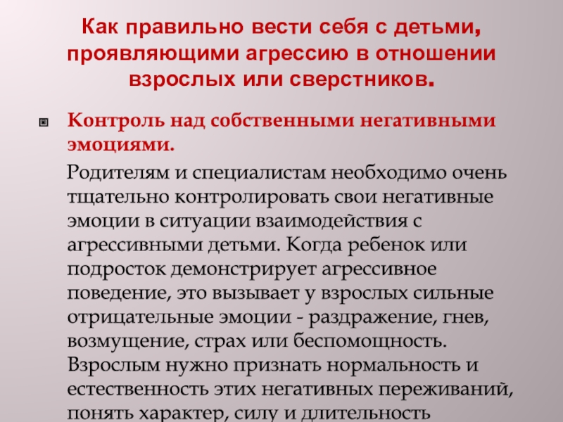необходимо очень тщательно контролировать свои негативные эмоции в ситуации взаимодействия с агрессивными детьми. Когда ребенок или подросток демонстрирует агрессивное поведение, это вызывает у взрослых сильные отрицательные эмоции - раздражение, гнев, возмущение, страх или беспомощность. Взрослым нужно признать нормальность и естественность этих негативных переживаний, понять характер, силу и длительность возобладавших чувств.