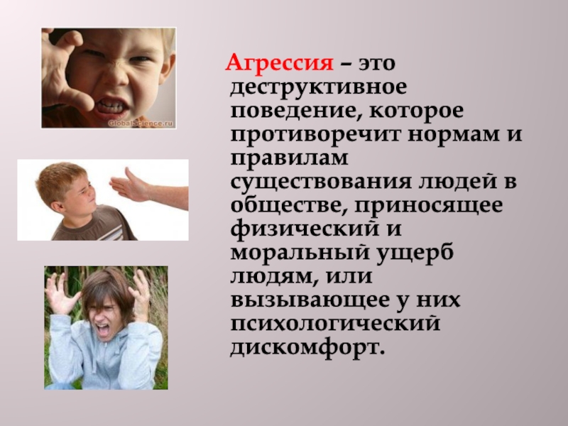 Слайд 2 Агрессия – это деструктивное поведение, которое противоречит нормам и правилам