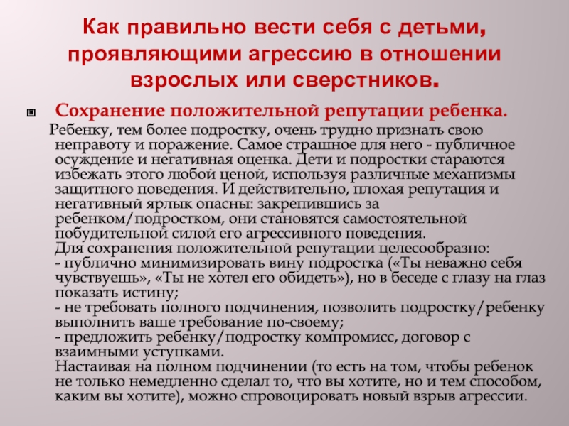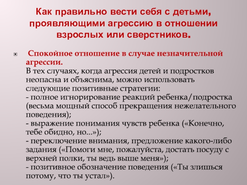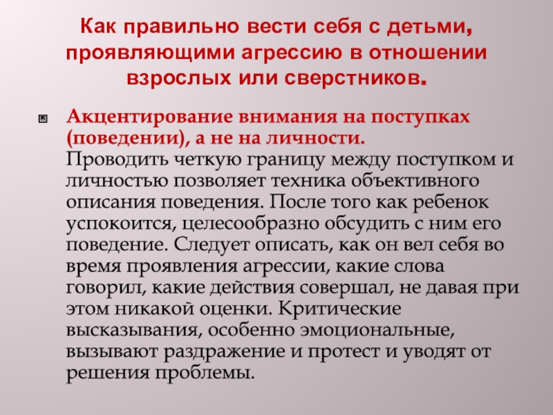 Слайд 13Как правильно вести себя с детьми, проявляющими агрессию в отношении