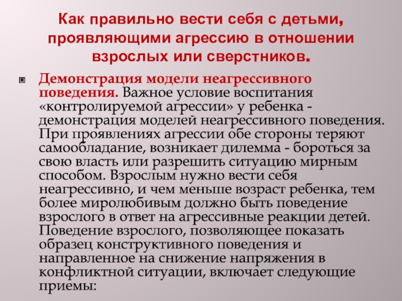 агрессии» у ребенка - демонстрация моделей неагрессивного поведения. При проявлениях агрессии обе стороны теряют самообладание, возникает дилемма - бороться за свою власть или разрешить ситуацию мирным способом. Взрослым нужно вести себя неагрессивно, и чем меньше возраст ребенка, тем более миролюбивым должно быть поведение взрослого в ответ на агрессивные реакции детей.