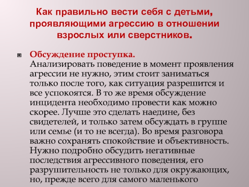 нужно, этим стоит заниматься только после того, как ситуация разрешится и все успокоятся. В то же время обсуждение инцидента необходимо провести как можно скорее. Лучше это сделать наедине, без свидетелей, и только затем обсуждать в группе или семье (и то не всегда). Во время разговора важно сохранять спокойствие и объективность. Нужно подробно обсудить негативные последствия агрессивного поведения, его разрушительность не только для окружающих, но, прежде всего для самого маленького агрессора.