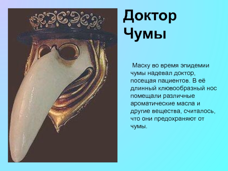 Доктор Чумы Маску во время эпидемии чумы надевал доктор, посещая пациентов. В её длинный клювообразный нос помещали
