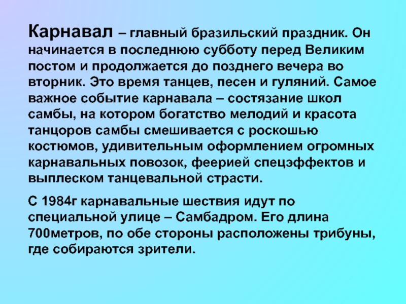 Слайд 3Карнавал – главный бразильский праздник. Он начинается в последнюю субботу