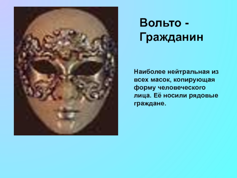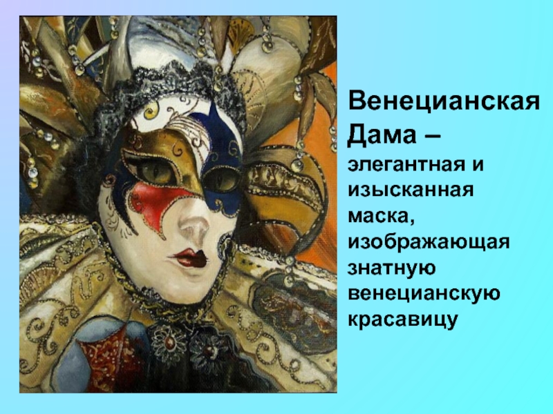 Слайд 13Венецианская Дама – элегантная и изысканная маска, изображающая знатную венецианскую