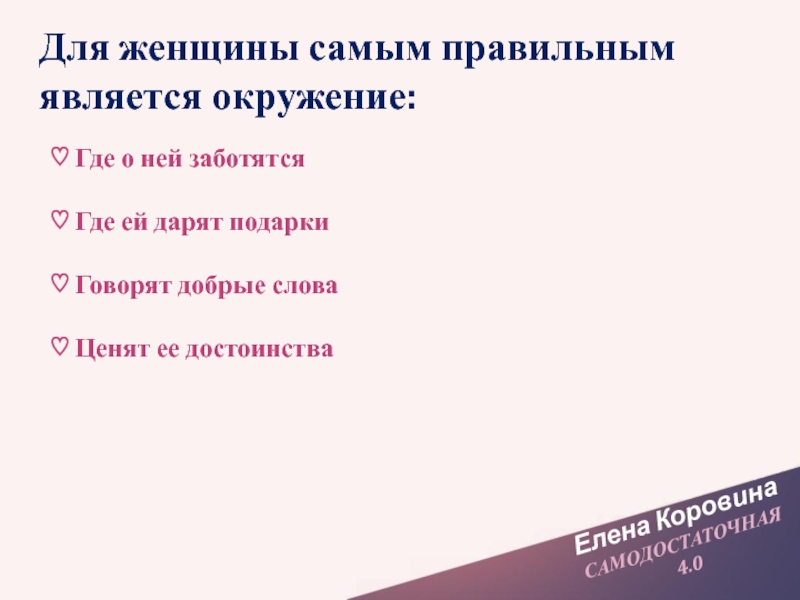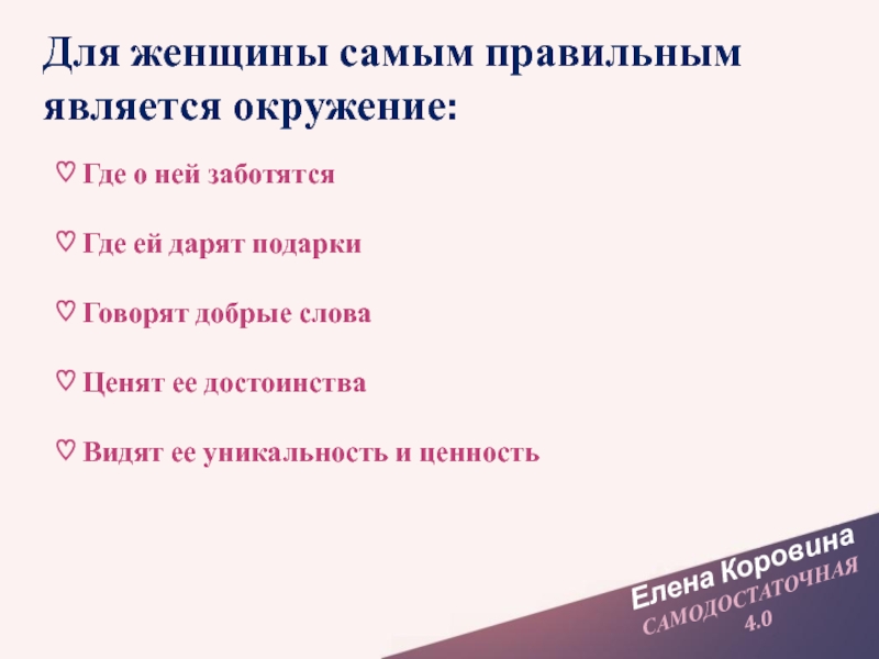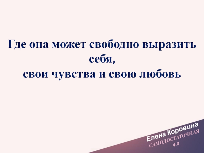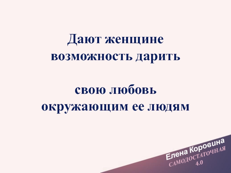Елена Коровина САМОДОСТАТОЧНАЯ 4.0Дают женщине  возможность дарить  свою любовьокружающим ее людям