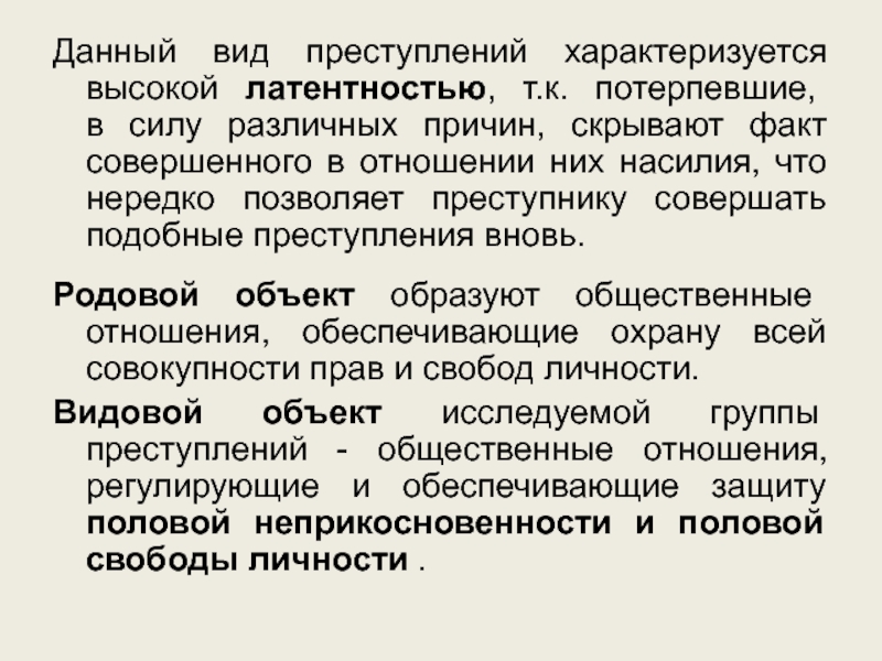 Видовой объект исследуемой группы преступлений - общественные отношения, регулирующие и обеспечивающие защиту половой неприкосновенности и половой свободы личности .