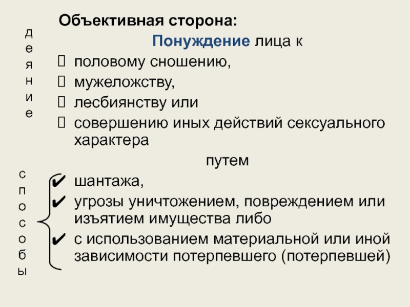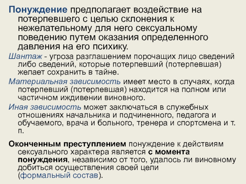 Слайд 29Понуждение предполагает воздействие на потерпевшего с целью склонения к нежелательному