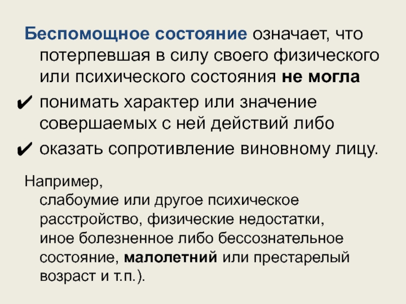 Слайд 13Беспомощное состояние означает, что потерпевшая в силу своего физического или