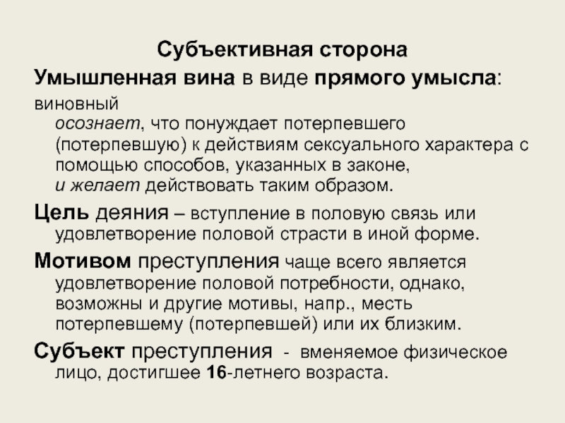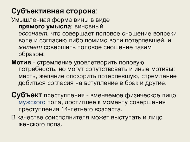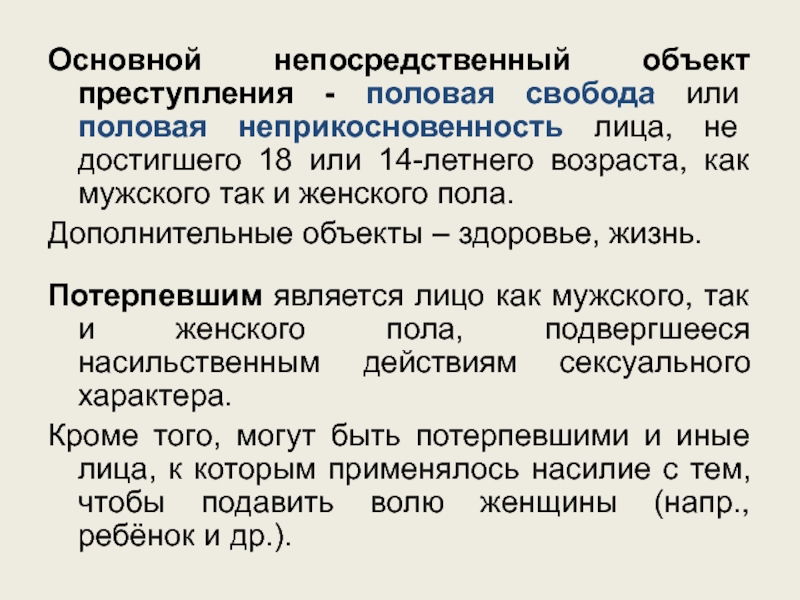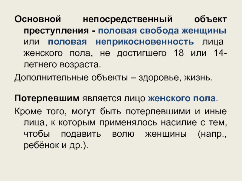Слайд 10Основной непосредственный объект преступления - половая свобода женщины или половая