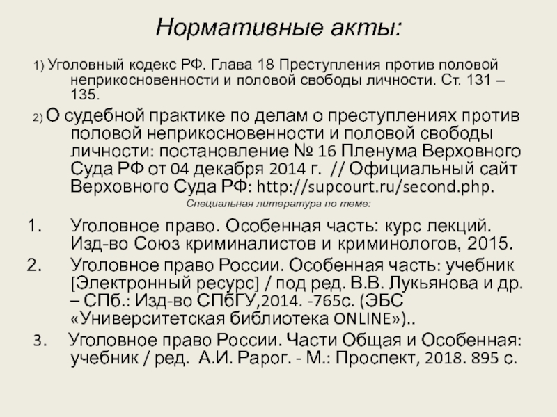 судебной практике по делам о преступлениях против половой неприкосновенности и половой свободы личности: постановление № 16 Пленума Верховного Суда РФ от 04 декабря 2014 г. // Официальный сайт Верховного Суда РФ: http://supcourt.ru/second.php.