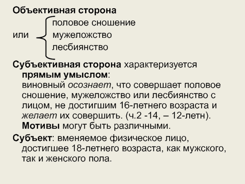 виновный осознает, что совершает половое сношение, мужеложство или лесбиянство с лицом, не достигшим 16-летнего возраста и желает их совершить. (ч.2 -14, – 12-летн).
