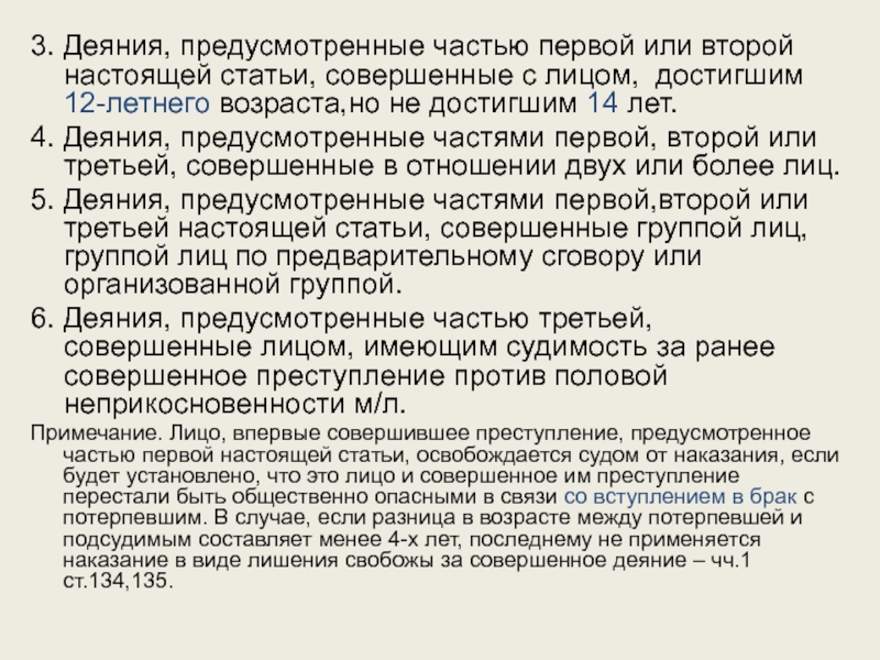 Примечание. Лицо, впервые совершившее преступление, предусмотренное частью первой настоящей статьи, освобождается судом от наказания, если будет установлено, что это лицо и совершенное им преступление перестали быть общественно опасными в связи со вступлением в брак с потерпевшим. В случае, если разница в возрасте между потерпевшей и подсудимым составляет менее 4-х лет, последнему не применяется наказание в виде лишения свобожы за совершенное деяние – чч.1 ст.134,135.