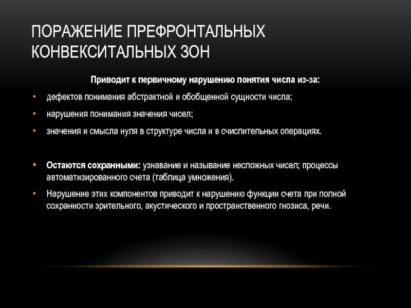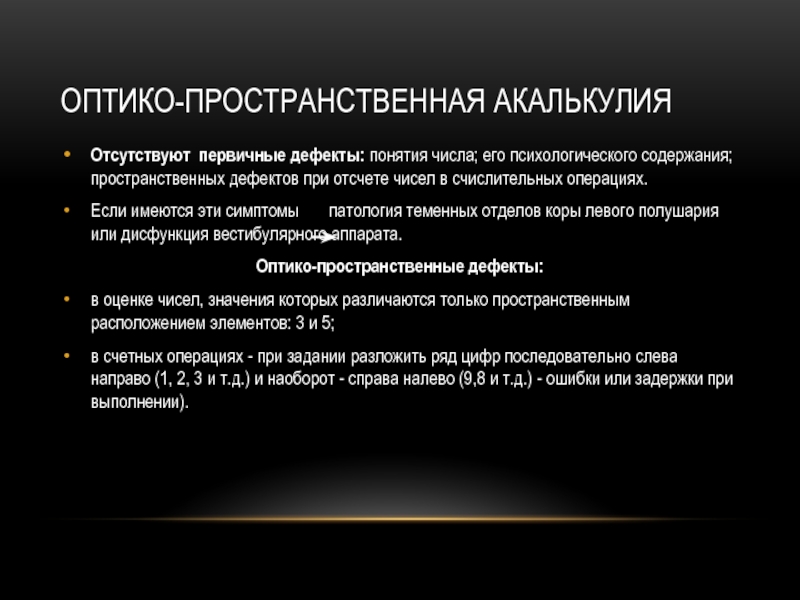 Нарушение этих компонентов приводит к нарушению функции счета при полной сохранности зрительного, акустического и пространственного гнозиса, речи.