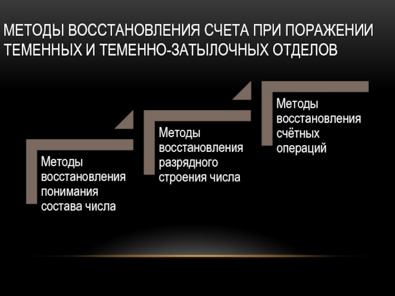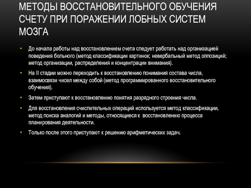 Слайд 13Методы восстановительного обучения счету при поражении лобных систем мозга