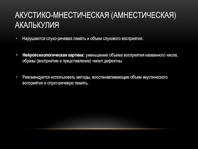 Слайд 8акустико-мнестическАЯ (амнестическАЯ) акалькулиЯ