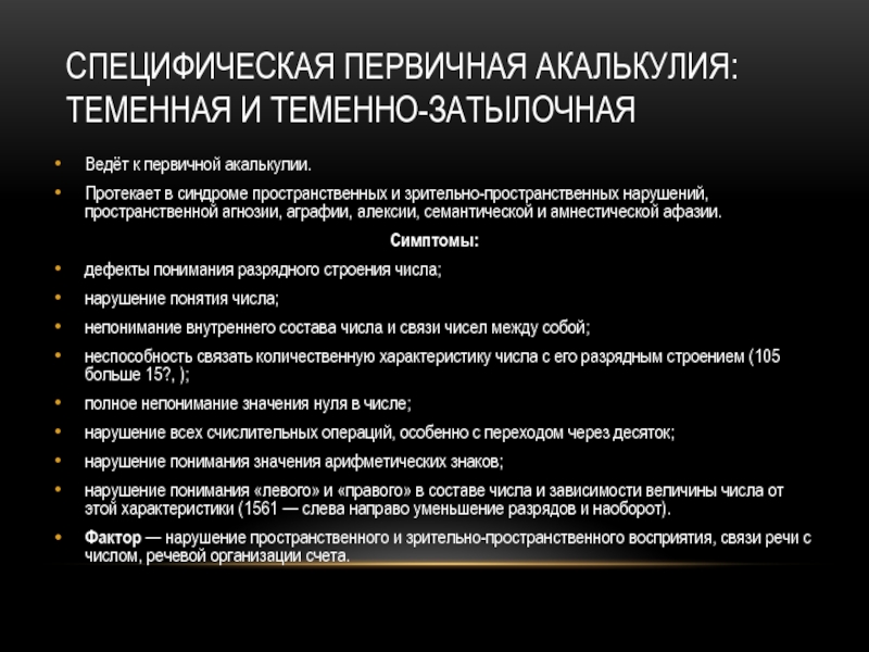 Слайд 14Специфическая первичная акалькулия: теменная и теменно-затылочная