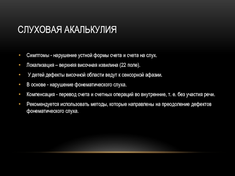 Слайд 7Слуховая акалькулия