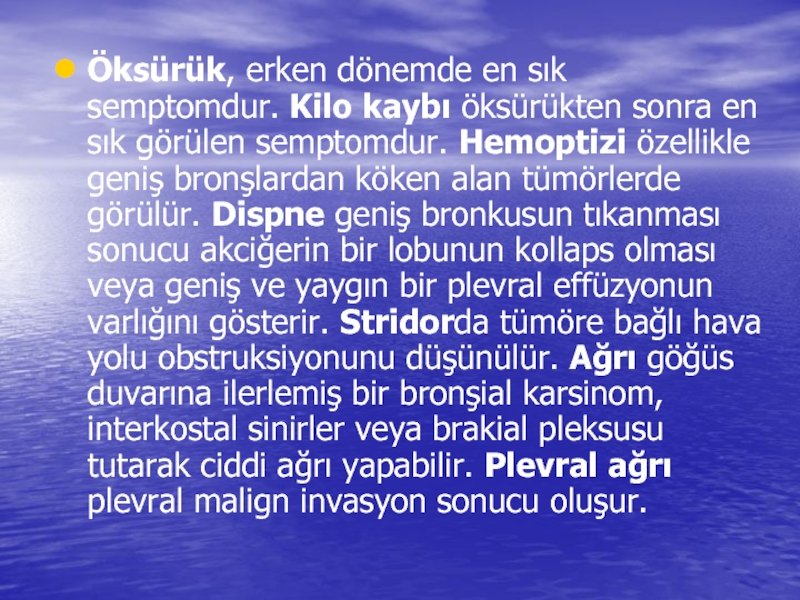 tümörlerde görülür. Dispne geniş bronkusun tıkanması sonucu akciğerin bir lobunun kollaps olması veya geniş ve yaygın bir plevral effüzyonun varlığını gösterir. Stridorda tümöre bağlı hava yolu obstruksiyonunu düşünülür. Ağrı göğüs duvarına ilerlemiş bir bronşial karsinom, interkostal sinirler veya brakial pleksusu tutarak ciddi ağrı yapabilir. Plevral ağrı plevral malign invasyon sonucu oluşur.