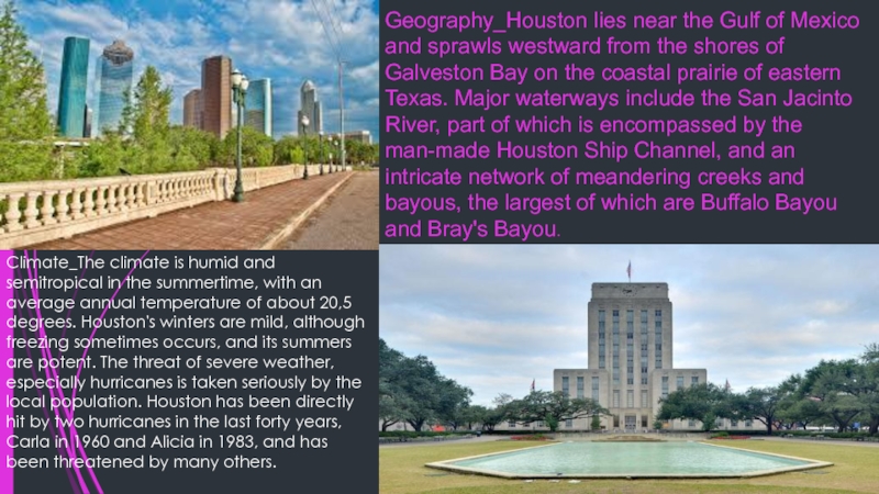 Geography_Houston lies near the Gulf of Mexico and sprawls westward from the shores of Galveston Bay on the coastal prairie of eastern Texas. Major waterways include the San Jacinto River, part of which is encompassed by the man-made Houston Ship Channel, and an intricate network of meandering creeks and bayous, the largest of which are Buffalo Bayou and Bray's Bayou.