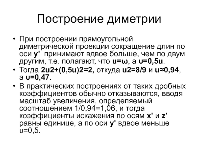 В практических построениях от таких дробных коэффициентов обычно отказываются, вводя масштаб увеличения, определяемый соотношением 1/0,94=1,06, и тогда коэффициенты искажения по осям x' и z' равны единице, а по оси y' вдвое меньше υ=0,5.