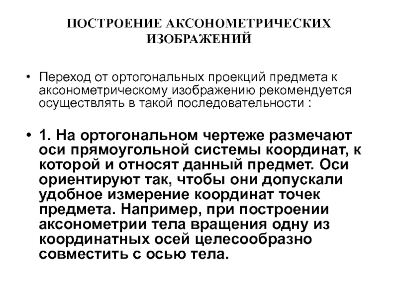 оси прямоугольной системы координат, к которой и относят данный предмет. Оси ориентируют так, чтобы они допускали удобное измерение координат точек предмета. Например, при построении аксонометрии тела вращения одну из координатных осей целесообразно совместить с осью тела.
