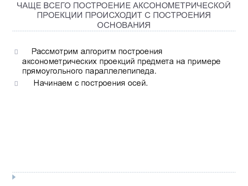 Слайд 10ЧАЩЕ ВСЕГО ПОСТРОЕНИЕ АКСОНОМЕТРИЧЕСКОЙ ПРОЕКЦИИ ПРОИСХОДИТ С ПОСТРОЕНИЯ ОСНОВАНИЯ