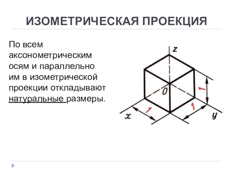 ИЗОМЕТРИЧЕСКАЯ ПРОЕКЦИЯПо всем аксонометрическим осям и параллельно им в изометрической проекции откладывают натуральные размеры.