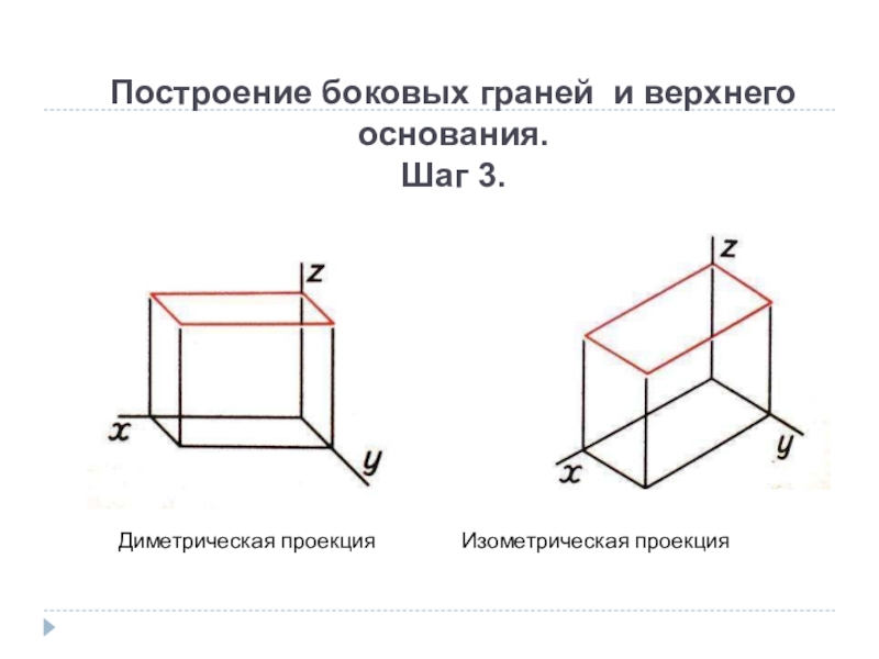 Построение боковых граней и верхнего основания. Шаг 3.   Диметрическая проекция