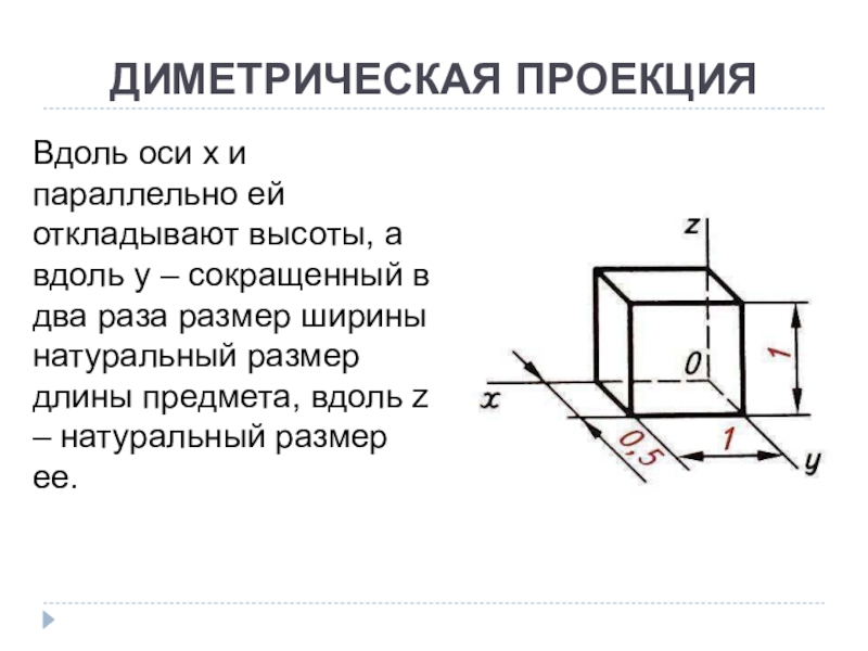 ДИМЕТРИЧЕСКАЯ ПРОЕКЦИЯВдоль оси x и параллельно ей откладывают высоты, а вдоль y – сокращенный в два раза