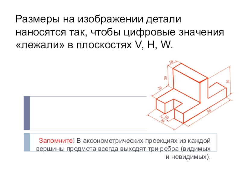 Размеры на изображении детали наносятся так, чтобы цифровые значения «лежали» в плоскостях V, H, W.Запомните! В аксонометрических