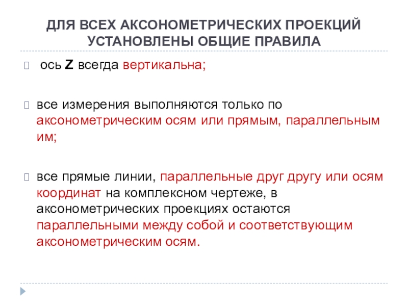 Слайд 9ДЛЯ ВСЕХ АКСОНОМЕТРИЧЕСКИХ ПРОЕКЦИЙ УСТАНОВЛЕНЫ ОБЩИЕ ПРАВИЛА