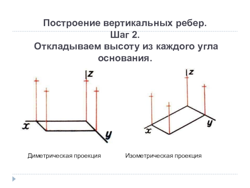 Слайд 12Построение вертикальных ребер. Шаг 2. Откладываем высоту из каждого угла основания.