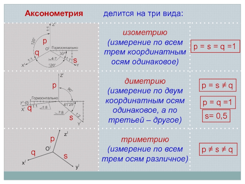Аксонометрия делится на три вида: