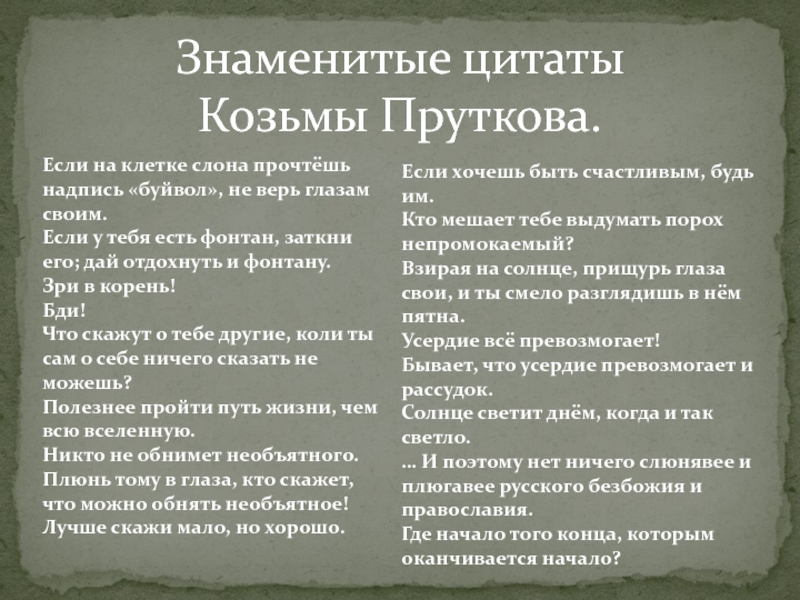 Сатирические стихи, афоризмы Козьмы Пруткова и самый его образ высмеивали умственный застой, политическую «благонамеренность», пародировали литературное эпигонство.