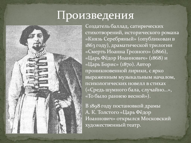 В 1898 году постановкой драмы А. К. Толстого «Царь Фёдор Иоаннович» открылся Московский художественный театр.
