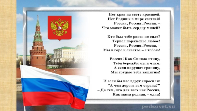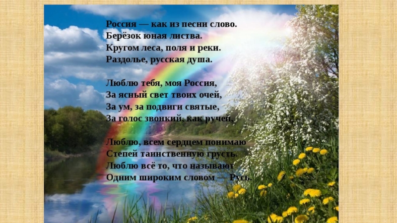 в жизни злоба не касалась... И стрелами звеневшие бои Лишь прерывали труд ее всегдашний. Недаром конь могучего Ильи Оседлан был хозяином на пашне.И в схватке с самой лютою войною Она и ад сумела превозмочь. Тому порукой - города-герои В огнях салюта в праздничную ночь! И вечно тем сильна моя страна, Что никого нигде не унижала. Ведь доброта сильнее, чем война, Как бескорыстье действеннее жала. Встает заря, светла и горяча. И будет так вовеки нерушимо. Россия начиналась не с меча, И потому она непобедима!