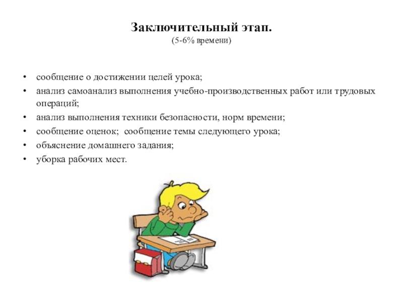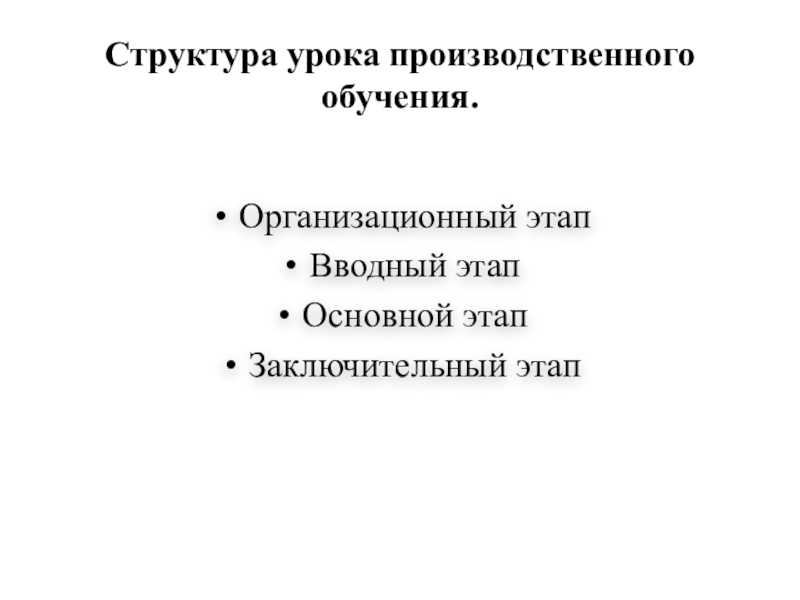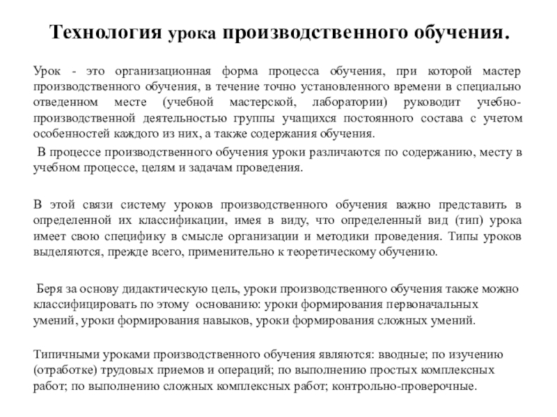Основной формой организации производственного обучения учащихся в учебных мастерских является урок. Уроку производственного обучения присущи четкость цели и содержания, а также организационной структуры – вводный инструктаж, упражнения (самостоятельная работа) учащихся и текущий инструктаж, заключительный инструктаж.