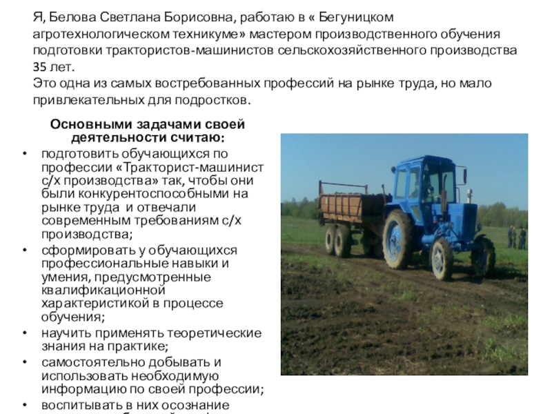 Слайд 23Я, Белова Светлана Борисовна, работаю в « Бегуницком агротехнологическом техникуме»